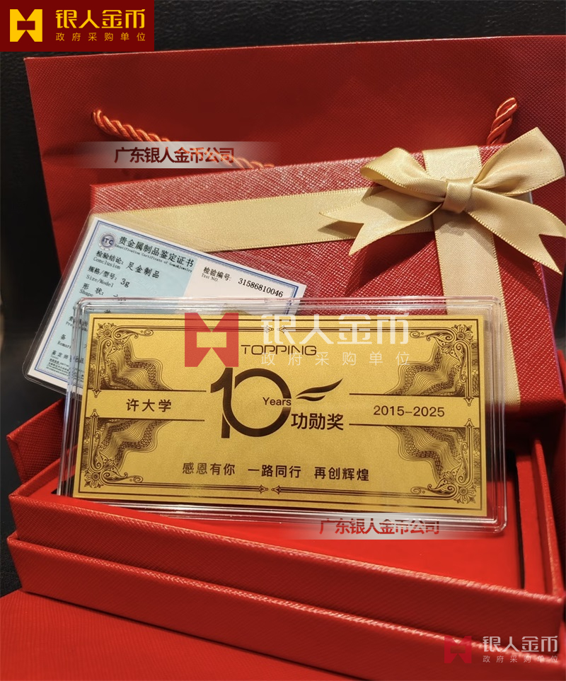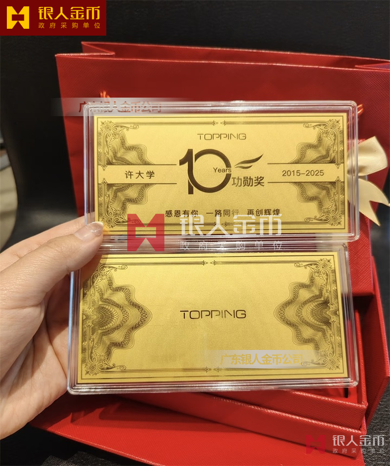 杭州TOPPING公司黄金金钞定制_员工入职10周年功贺奖金卡定制_员工工作满10年金牌定制_10年员工金子定制_入职纪念金钞定制